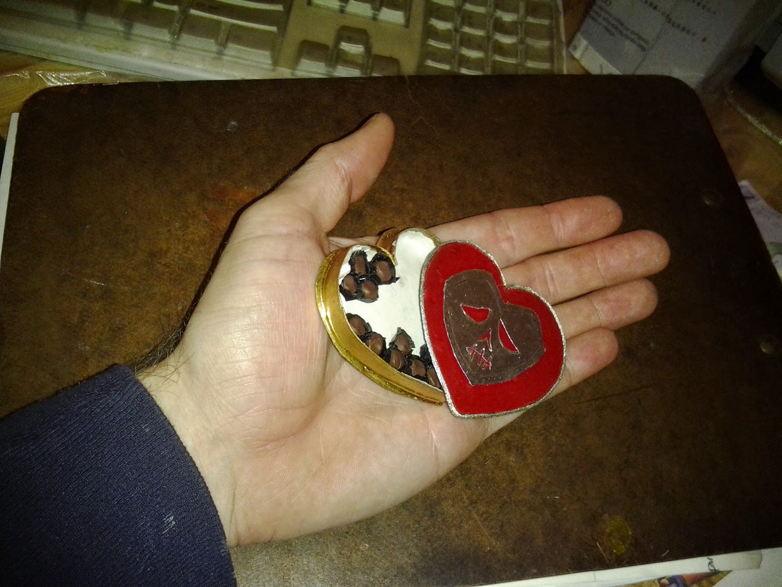 So then I moved onto the prop I came up with for this piece. Originally, I was going to place a cigarette in her hand, but then a better idea manifested - a candy box. I used a box of Junior Mints and simply cut out a couple of heart shapes, then glued a border around one of them to create the box. I also added some very thin gold thread around the contoured edges to give it a classier feel, then painted it gold. The chocolate pieces were made from colored Sculpey and I used actually Reese's peanut butter cup wrappers for them. The last thing I did was add my heart-skull design onto the lid, which was cut from metal tape and stuck on the painted red lid.